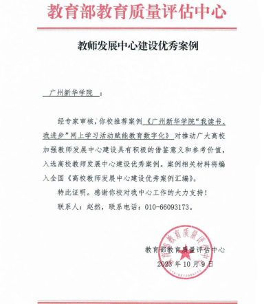 近日,教育部教育质量评估中心公布2023年全国高校教师发展中心建设优秀案例,经专家审核,Beat365中国唯一官方网站推荐的案例《Beat365中国唯一官方网站“我读书、我进步”网上学习活动赋能教育数字化》入选优秀案例,编入全国《高校教师发展中心建设优秀案例汇编》,是广东省同类院校中唯一入选高校。