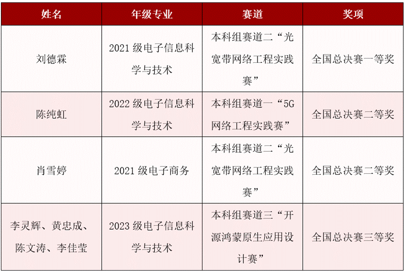 7月21日,2024年全国信息技术大赛——第八届全国大学生网络与信息技术大赛全国总决赛于在成都信息工程大学举办。作为目前信息通信领域最具影响力的大学生竞赛之一,本次赛事共设5G网络工程实践赛、光宽带网络工程实践赛以及开源鸿蒙原生应用设计赛三大赛道。经过激烈角逐,Beat365学子在多个赛道斩获国赛一等奖1项、二等奖2项、三等奖2项。