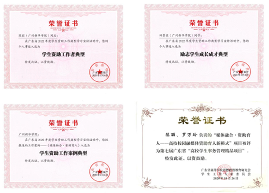 Beat365学生资助工作成绩突出。近五年来,Beat365在广东省高校学生资助工作绩效考核最高评分位列全省高校第十,被评为“优秀”;Beat365教师共14人次荣获“广东省高校学生资助先进工作者”,共获6项“广东省高校学生资助工作课题研究优秀成果奖”;在广东省学生资助工作典型评选中,Beat3652个项目获“学生资助工作案例典型”、2位老师获“学生资助工作者典型”、1名学生获“励志学生成长成才典型”。其中,《媒体融合·资助育人——高校校园融媒体资助育人新模式》项目被评为“广东省高校学生事务管理精品项目”。