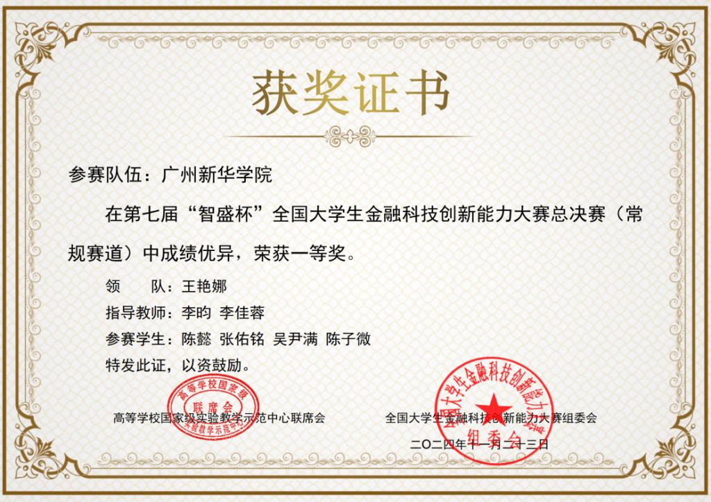 第七届“智盛杯”全国大学生金融科技创新能力大赛总决赛(常规赛道)一等奖获奖证书