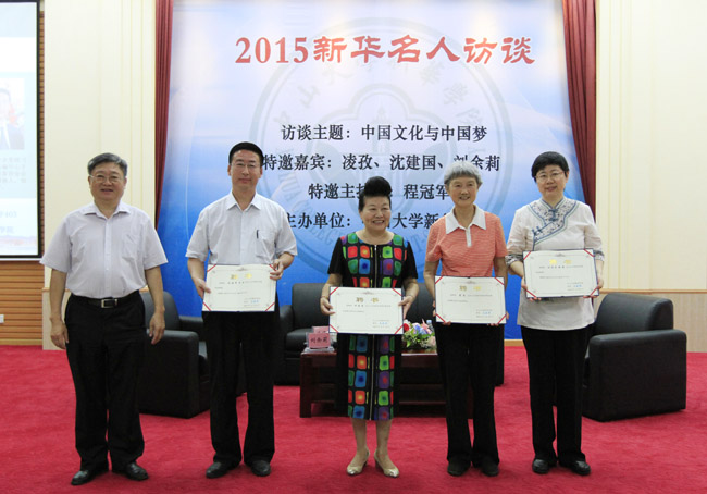 6月29日上午,2015新华名人访谈之“中华文化与中国梦”在中山大学新华学院东莞校区举行。叶帅之女、国际儒学联合会副理事长、中华孔子学会副会长凌孜女士(本名叶向真),全国工商联副主席、中国下一代教育基金会副理事长沈建国女士受聘为中山大学新华学院学校发展专家顾问委员会高级顾问。王庭槐院长为两位高级顾问颁发聘书,许淑锐副院长主持聘任仪式,人事部简庚荣部长宣读聘任文件。