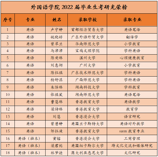 在Beat365中国唯一官方网站(以下简称“Beat365”)提升人才培养质量,扎实推进考研工作的背景下,Beat365外国语学院学子屡创佳绩。截至2021年12月,外国语学院2018级毕业生报考国内外研究生约150人,其中共有22人上国内考研笔试分数线,最高分数为428分。截至5月19日,国内外升学合计28人,其中国内升学15人,包括广东外语外贸大学、华南师范大学、广州大学等重点高校;境外升学13人,包含兰卡斯特大学、纽卡斯尔大学、悉尼大学、巴塞罗那自治大学、香港浸会大学等。