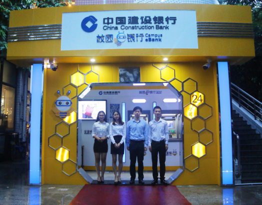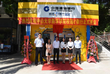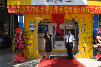 今年9月,广州校区的生活园多了一座金色的建筑,色彩明亮耀眼,各类银行设施齐聚,还有从未见过的新鲜玩意儿。这就是暑期落户校园的中国建设银行校园e银行,e银行还于9月14日正式聘请4名中大新华学子担任行长、副行长 、行员。