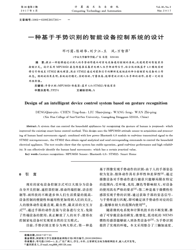 接下来,我们通过邓巧茵以第一作者于2017年4月在统计源核心期刊《计算机技术与自动化》刊物发表的论文《一种基于手势识别的智能设备控制系统的设计》,来感受这位勤于学习、善于思考、敢于创新的酷女孩的学术范儿。