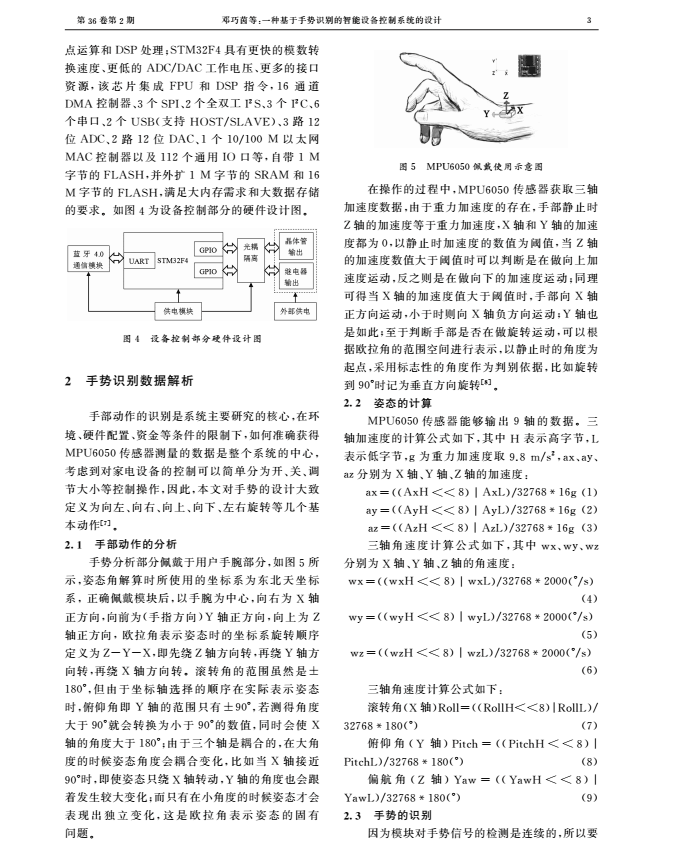 发表论文选择《一种基于手势识别的智能设备控制系统的设计》这个题目,是因为最开始是把手势识别作为大学生创新创业训练计划项目并获得国家级资助,有一定的研究基础,在原项目的基础上对系统进行了技术改进,主要研究手势识别数据解析、手部动作的分析以及滤波。采用整合了三轴加速度、三轴角速度、三轴姿态角的MPU6050模块搭配低功耗蓝牙模块对人的手部动作信号进行采集并进行相应的运算处理,然后通过蓝牙模块把信号发送至STM32微处理器进行模数转换,完成手势比对并发送对应的命令给家电设备实现手势的控制。在进行手势的识别时,滤除信号中相对较低的数据,以此降低精度和灵敏度,简化硬件的运算,再进行平滑滤波的处理,更易于对信号进行特征值的获取。