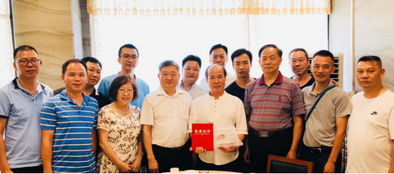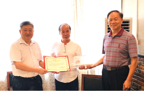 王庭槐校长(左)、许淑锐副校长(右)为总务处司机班原班长肖伦远(中)颁发荣休证书