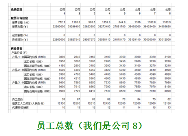 决策错误:价格的制定方面,我们打了低价格战术,而其他7间公司都几乎一致地把价格往上提了;增发回购方面,我们第四期把可以增发的股本限额都增发完成了,在提交决策前还在纠结要不要回购,最终决定提交。股息的理想状态是在比赛的第三期还完欠款(透支)或是还完短贷后完成派发,那样股价会升得比较快,从而有效地操纵了第三期的股价上升,往后股息的派发可以根据指数型递增或是线性递增进行派发就可以了。若没法达到理想状态,公司有利润的前提下,我们可以在第一期和第二期派发1%的股息,第三期派发3%甚至更多的股息,往后股息的派发可以根据指数型递增或是线性递增进行派发就可以了。