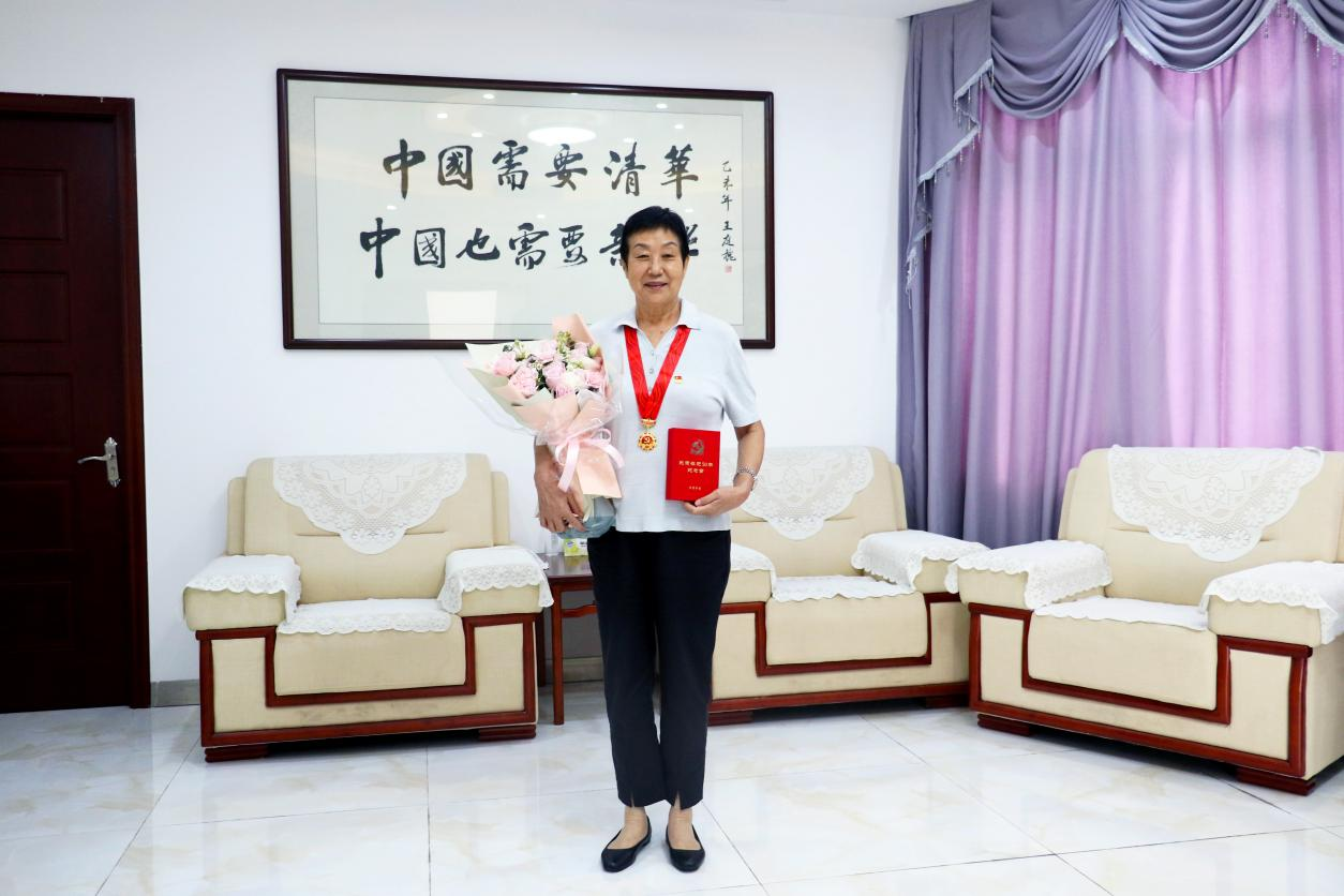 于凤兰(左)获颁奖章后与学校党委书记周云(右)合影(2022.7.1)