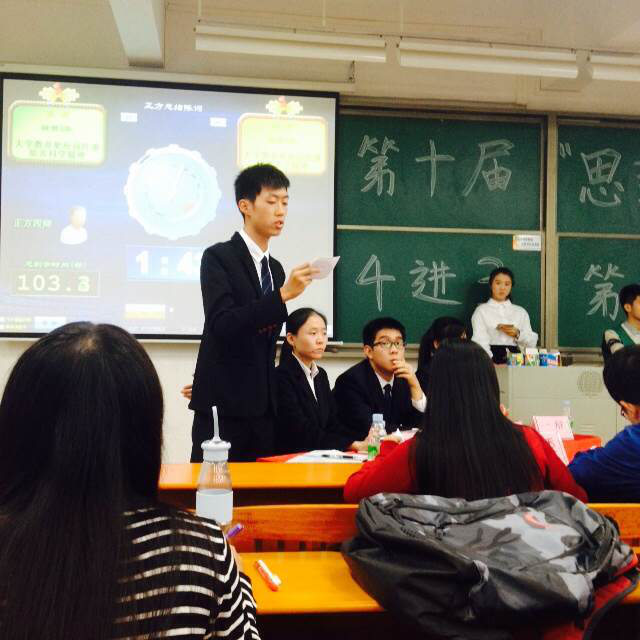 我比较难忘的一场比赛就是第十一届“思辩杯”,当时第一场抽到的就是法学,对面的阵容很强大,我们都以为赢的几率不大,但最后通过几番鏖战,我们赢了。