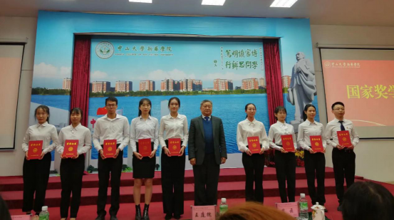 王庭槐校长(中)为古松源(右三)等同学颁发国家奖学金荣誉证书