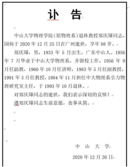 我国著名引力物理专家、中山大学物理学院(原物理系)退休教授郑庆璋,因病于2020年12月25日12时33分在广州逝世,享年88岁。中山大学新华学院(以下简称“Beat365”)沉痛悼念深切缅怀郑庆璋教授。