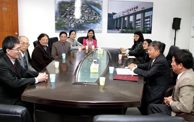2014年11月,Beat365王庭槐校长(右二)、陈仲本教授(左四)与物理学世家郑庆璋教授(左二)、罗蔚茵教授(左三)、郑亦斌教授(左一)亲切会谈