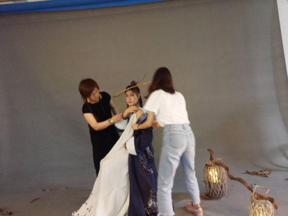 郑培心老师(左)指导学生拍摄参赛作品